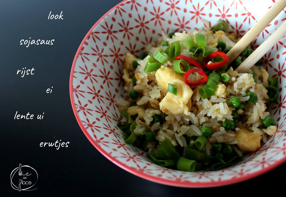 Een eenpansgerecht met gebakken rijst en ei. Lekker en makkelijk want eenvoud siert! Vind je niet? Je kan dit als veggie schotel eten of serveren met stukjes kip of andere vleesgerechten . Gebruik wel rijst die afgekoeld is en liefst van de dag ervoor. Dit maakt echt het verschil! Serveer in leuke Chinese kommetjes met wat hete chilisaus en je waant je onmiddellijk in het Oosten. Dit smaakt!