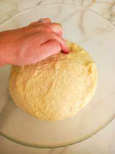 Wanneer het deeg gerezen is, neem je het uit de kom en leg je het op je werkblad. Duw voorzichtig met je vingers de lucht uit het deeg. Verdeel in 8 porties (100 g/bol). Bol ieder stukje deeg goed op: vouw eerst de zijkanten van ieder stukje deeg naar het midden en draai het deeg om. Maak een kommetje van je hand en leg je hand op een stukje deeg. Druk het deeg tegen het werkoppervlak terwijl je een ronddraaiende beweging maakt. Als je het goed doet zie je een “naveltje” aan de onderkant van het deeg. Leg de bolletjes op een bakplaat met bakpapier. Zorg dat je voldoende plaats tussen elke bol laat. Bedek weer met plastic folie of een vochtige keukendoek. Laat de bollen weer rijzen voor 45-60 minuten of tot ze verdubbeld zijn in grootte. Het deeg is goed als je er met een vinger op drukt en het langzaam terug veert.