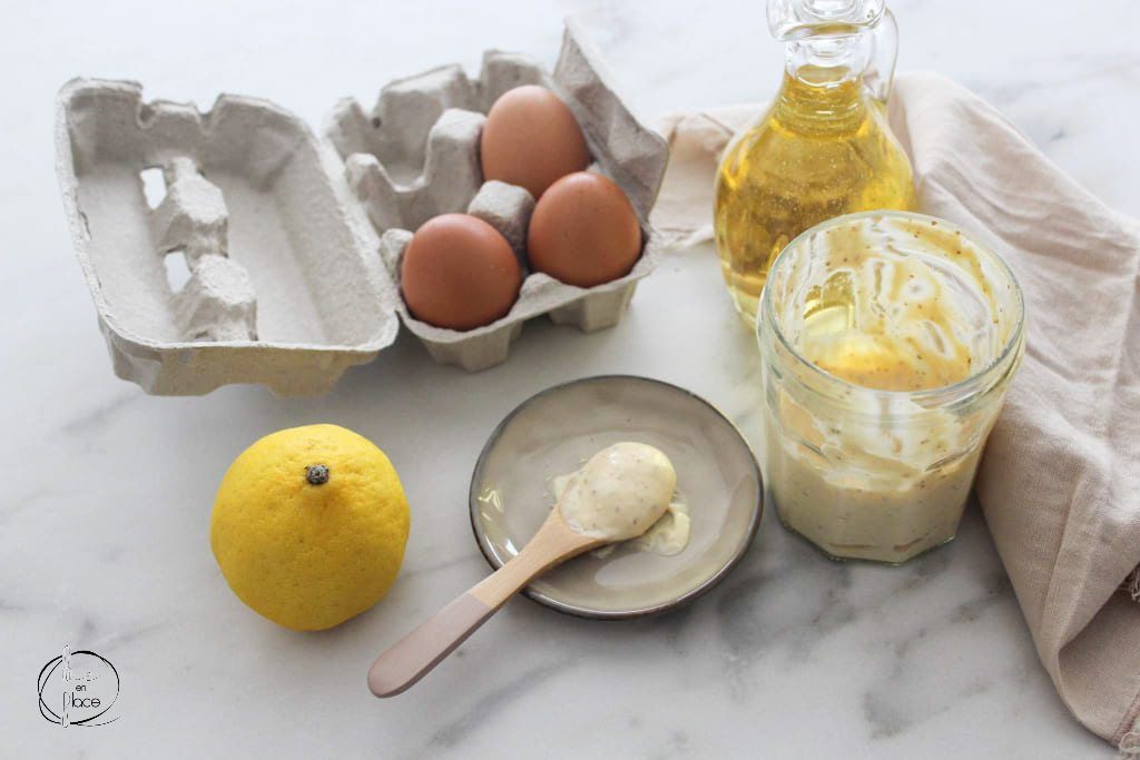 Doe 1 eetlepel mosterd in de hoge maatbeker van uw staafmixer. Voeg er de eierdooiers bij, 2 eetlepels citroensap, 2 eetlepels water en 400 ml olie. Zet de staafmixer mooi beneden op de bodem bij de binding. Start de mixer en van zodra je witte mayonaise ziet… ga je met de mixer langzaam naar omhoog. Ga pas hoger als rondom het mes van uw mixer alleen witte mayonaise te zien is. Van zodra je boven bent ga je nog een paar keer geheel op en neer met de nog draaiende mixer. Kruid met peper en zout eventueel nog een beetje citroensap en/of mosterd.
