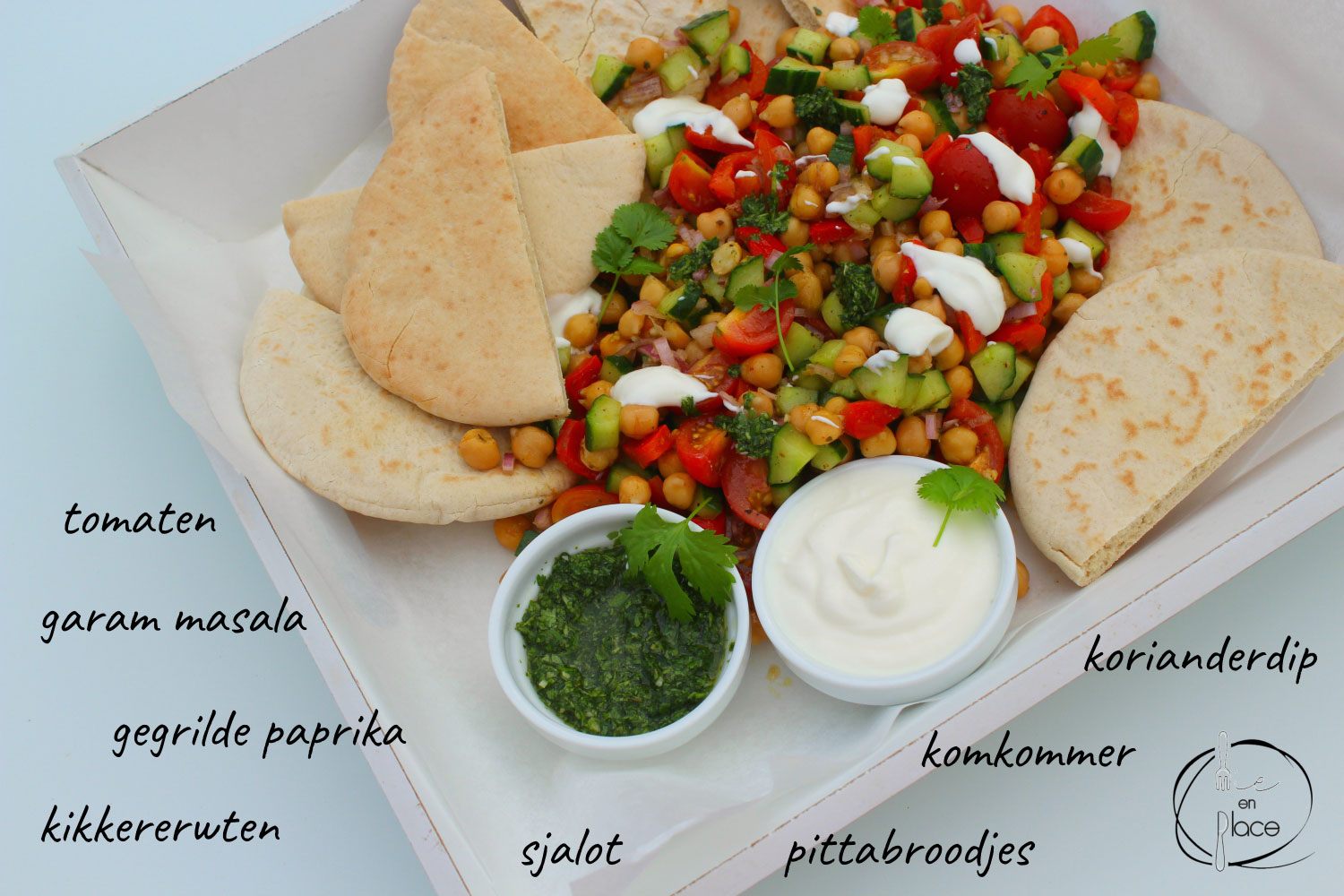 Serveer de kikkererwtensalade met pittabroodjes de korianderdip en wat yoghurt.