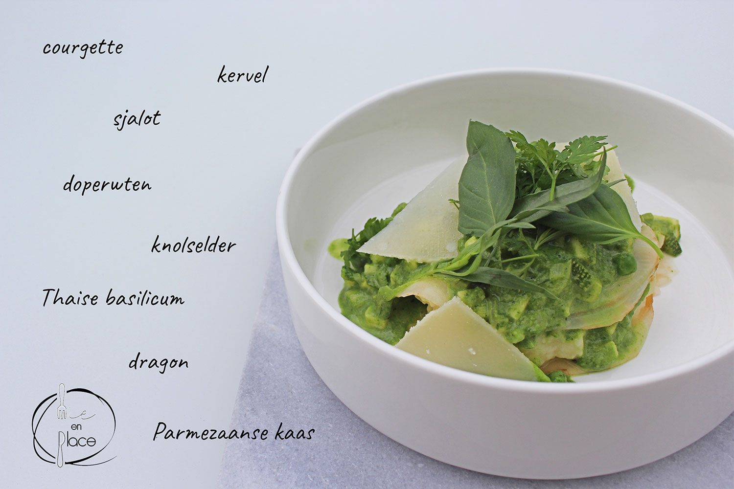 Spoel een courgette, ik heb deze niet geschild. Snijd samen met de sjalot in fijne brunoise en stoof aan in een beetje olijfolie. Giet een deel van de basissaus bij de groentjes. Kruid met peper en eventueel wat zout. Voeg ook wat doperwten toe. Ik heb bij de saus een beetje geraspte Parmezaanse kaas toegevoegd.