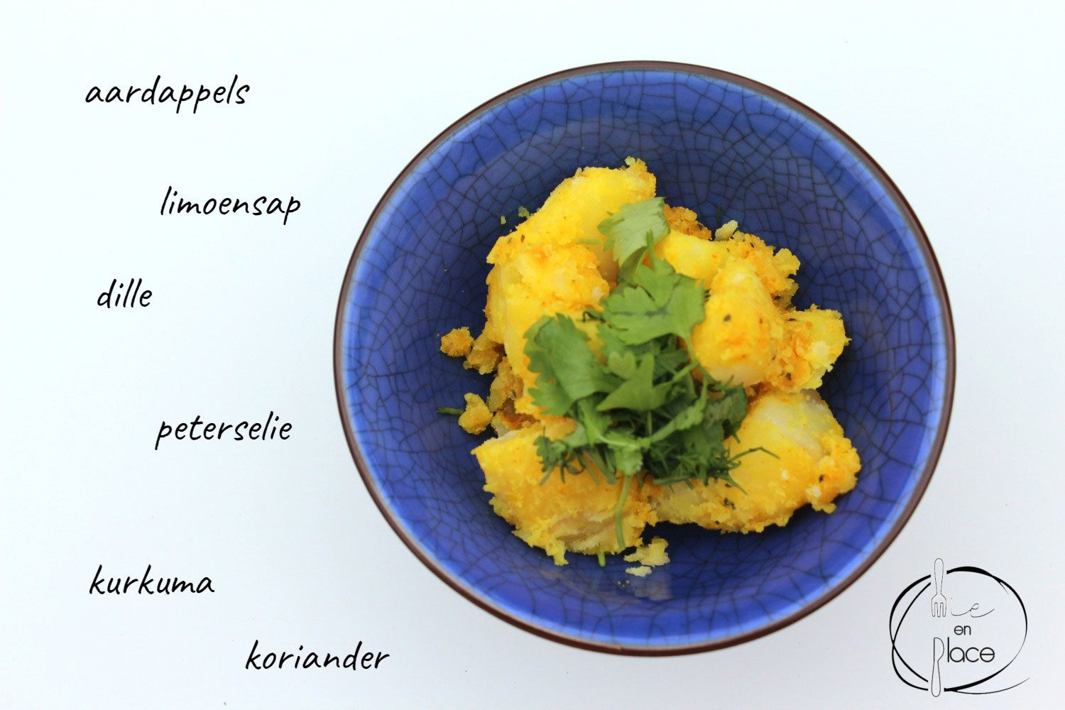 Dit is volgens mij de Oosterse tegenhanger voor patatas bravas. Een pittige aardappelsalade met een prachtige gele kleur door de kurkuma, een onweerstaanbare smaak door de kruidenmengeling en in evenwicht gebracht door de verse kruiden. Ik serveer dit graag met een lepeltje zure room, maar dit hoeft natuurlijk niet. Je kan trouwens de pittigheid van deze aardappelsalade zelf aanpassen door te spelen met de hoeveelheden kruiden.
