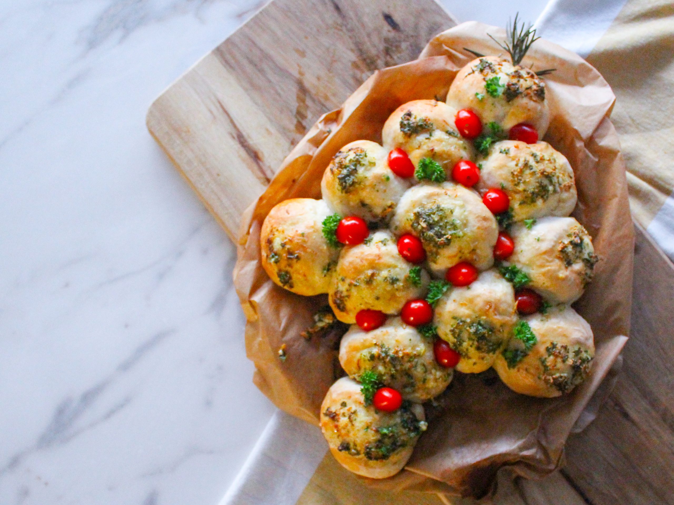 Verdeel het deeg daarna in bolletjes van 50 g. Wil je iets kleinere broodjes? 40 g werkt ook perfect. Leg ze mooi tegen elkaar in de vorm van een kerstboom, kransje of wat je maar wilt. Gebruik een ingevette ovenschaal of eentje met bakpapier en laat opnieuw rijzen tot ze zichtbaar luchtig zijn.